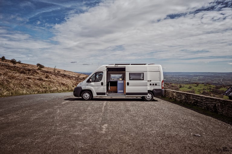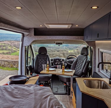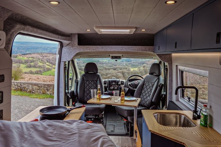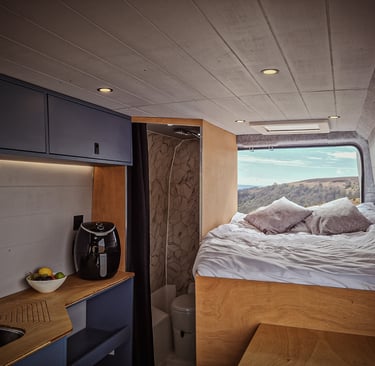 Off Grid Living - The van is equipped with two massive solar panels that help to keep the high tec lithium power system topped up, especially on those sunny days. This enables the van to be fully self-sufficient for multiple days without driving. On a bad weather week, the engine can be used to fast charge the batteries or plugging into a campsite mains, if they are getting low. Onboard there is a 3000w power inverter that provides power to a double and single UK socket, providing uninterrupted mains power in the van, on and off the grid. There are multiple USB/ USBc plugs around the van for charging devices. The van is also fitted with a 100L fresh water tank that can be topped up with an external filling point.