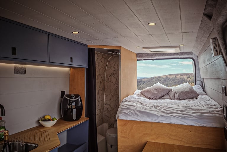 Sleeping - Have a great night's sleep on the memory foam mattress. A duvet and two pillows are provided, but please bring linen (standard double). With the bed sleeping forward in the van, it is the perfect solution for the taller users
