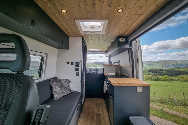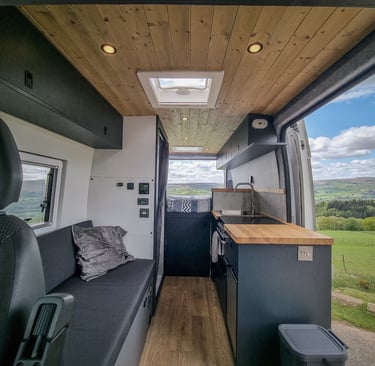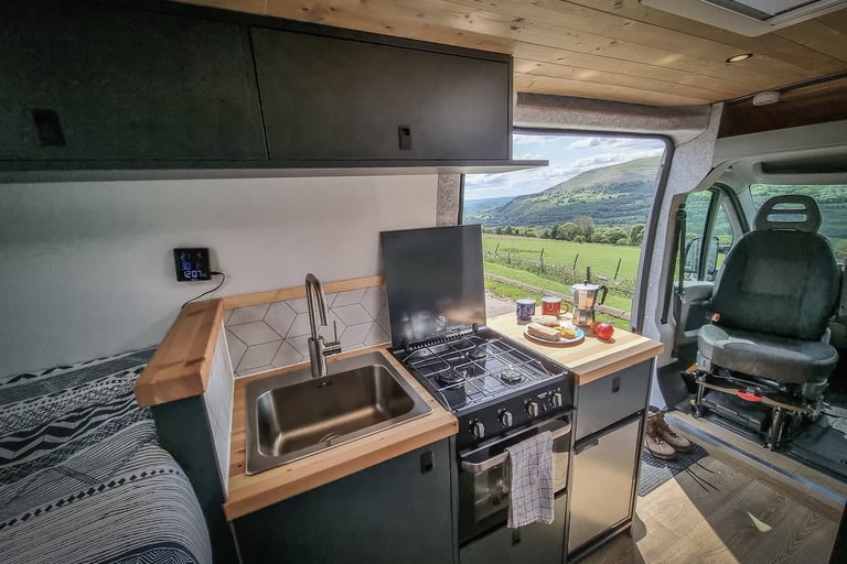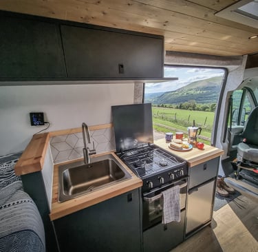 Kitchen - Let your culinary skills run wild, there aren't many things that you can't cook in the van. It is fully equipped with a three-ring burner, oven & grill. The sink has both hot & cold running water. It is also fitted with a fridge freezer to keep all of your beers nice and cold. There is everything from cutlery to pans ensuring you'll have everything you need.
