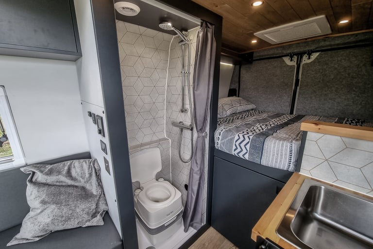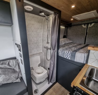 Off Grid Living - The van is equipped with two solar panels that help to keep the high tec lithium power system topped up, especially on those sunny days. This enables the van to be fully self-sufficient for multiple days without driving. On a bad weather week, the engine can be used to fast charge the batteries if they are getting low. Onboard there is a 1000w power inverter that provides power to a double UK socket for small domestic goods. There are multiple USB plugs around the van for charging devices. The van is fitted with a 100L fresh water tank and an underslung LPG tank that can both be refilled from an external filler point. There is also a portable toilet should you get caught short on your travels.